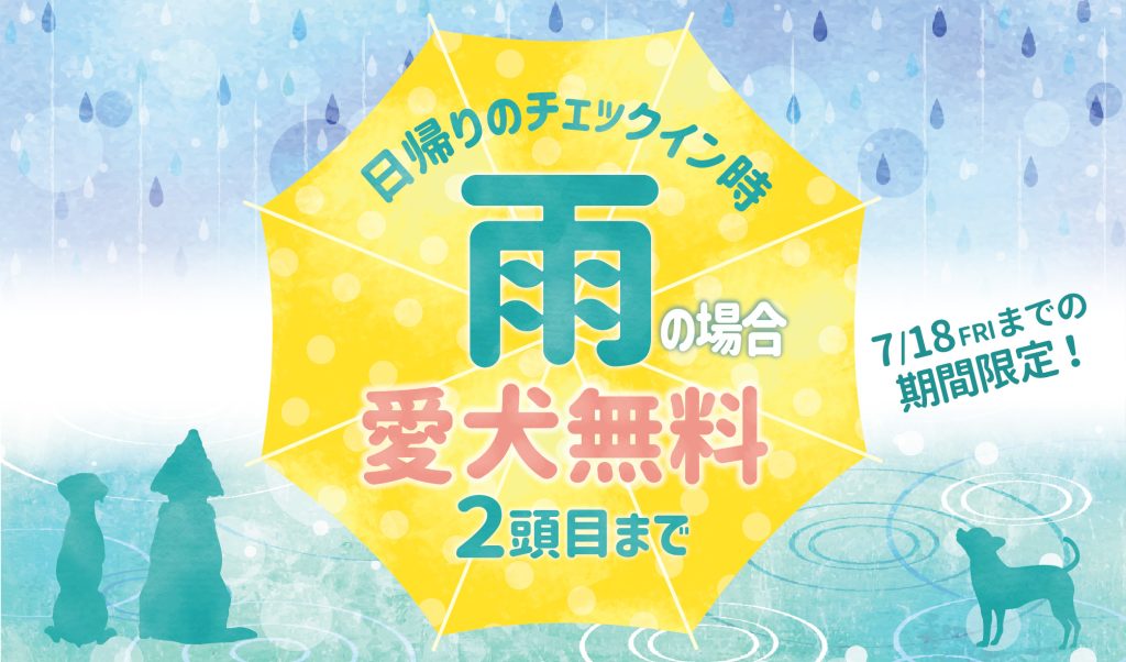 日帰りのチェックイン時に雨の場合、愛犬2頭目まで無料!