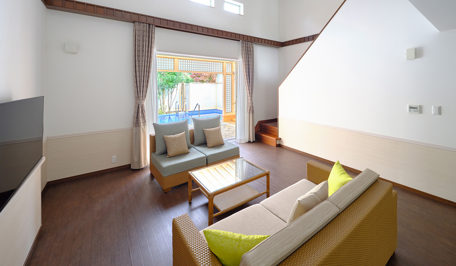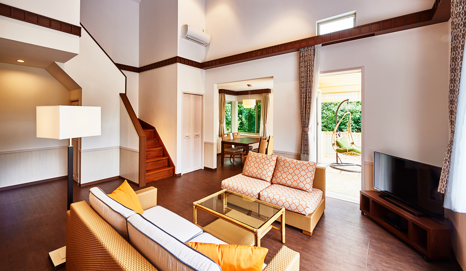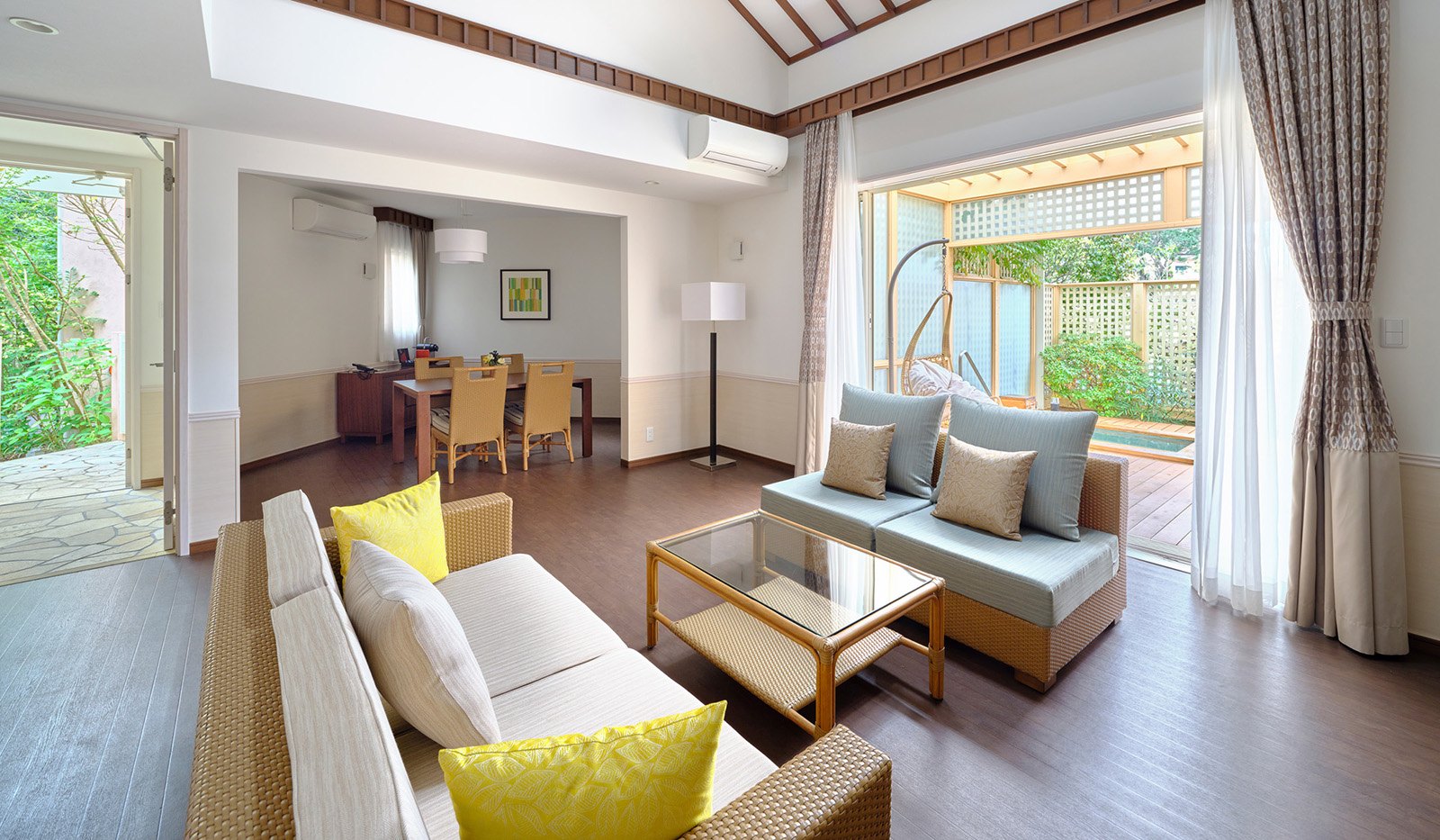 83㎡ある客室はメゾネットタイプ。1階はリビングとダイニング、2階には2つのベッドルームがあります。4名様までご宿泊可能で、お子様連れのご家族やご友人同士の集まりなどにも最適です。テラスデッキには贅沢なプライベートプールとジェットバスを設えており、リゾート気分を満喫頂けます。