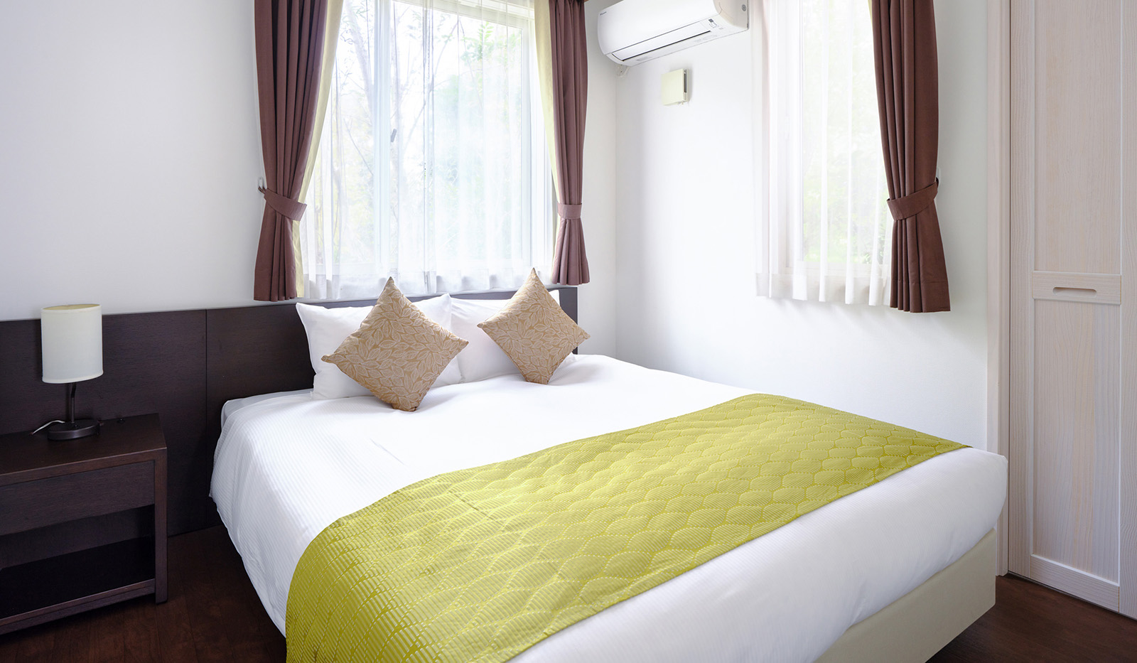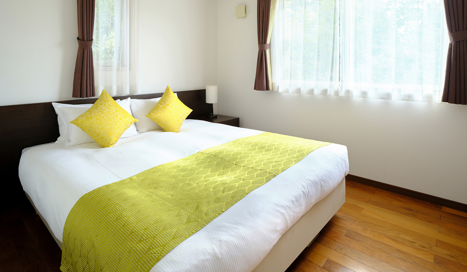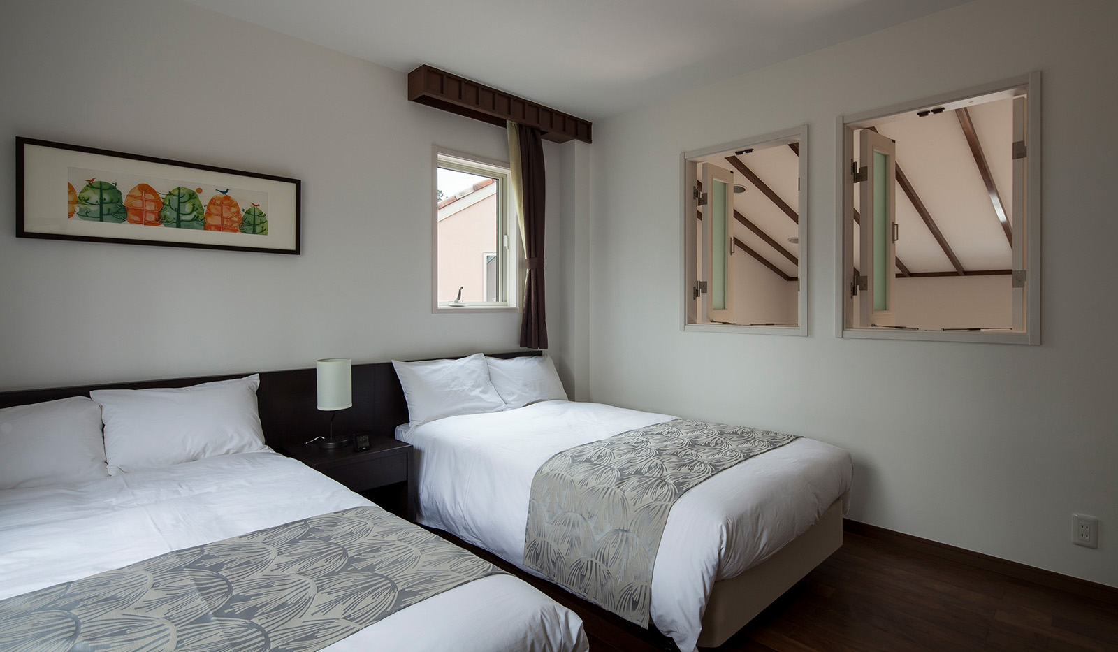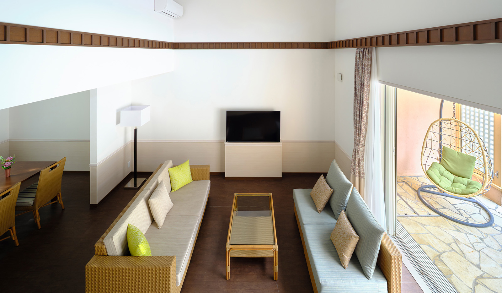 83㎡ある客室はメゾネットタイプ。1階はリビングとダイニング、2階には2つのベッドルームがあります。4名様までご宿泊可能で、お子様連れのご家族やご友人同士の集まりなどにも最適です。テラスデッキには贅沢なプライベートプールとジェットバスを設えており、リゾート気分を満喫頂けます。
