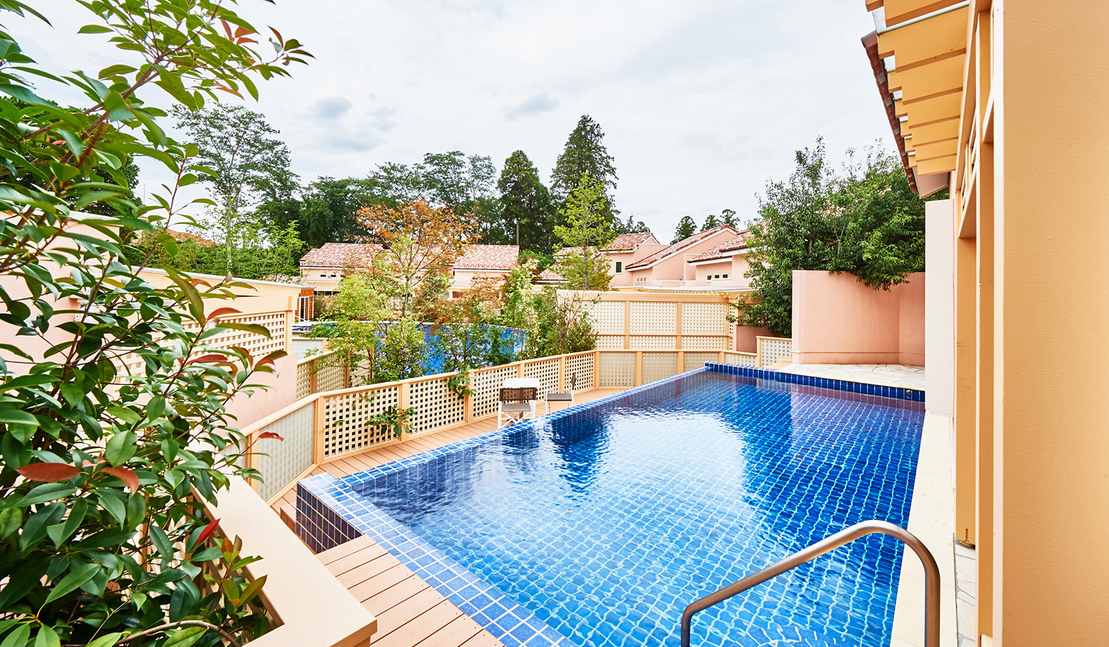プライベートプール、アクアマリンプール隣接、ジェットバス、2ベッドルーム(2F×2)、キッチン